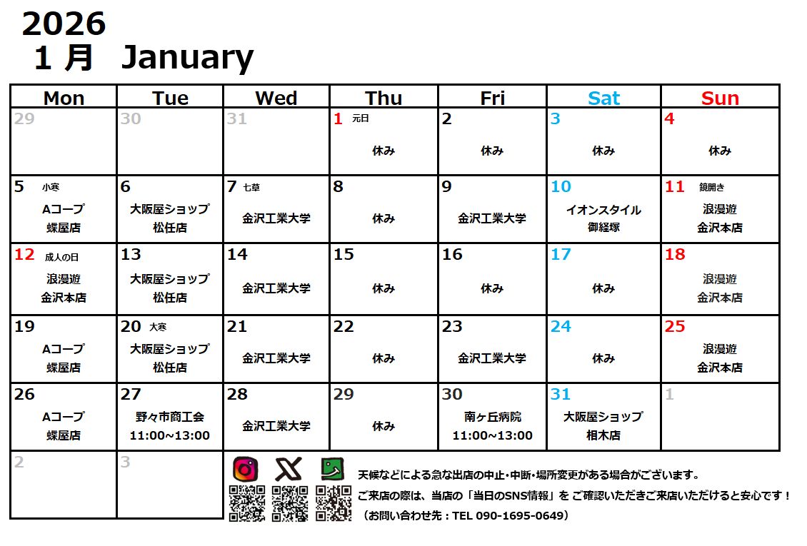 【変更】 1/25(日)浪漫遊金沢本店 → 大雪の為、出店中止です