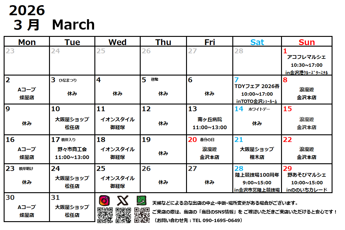 3月の出店カレンダー