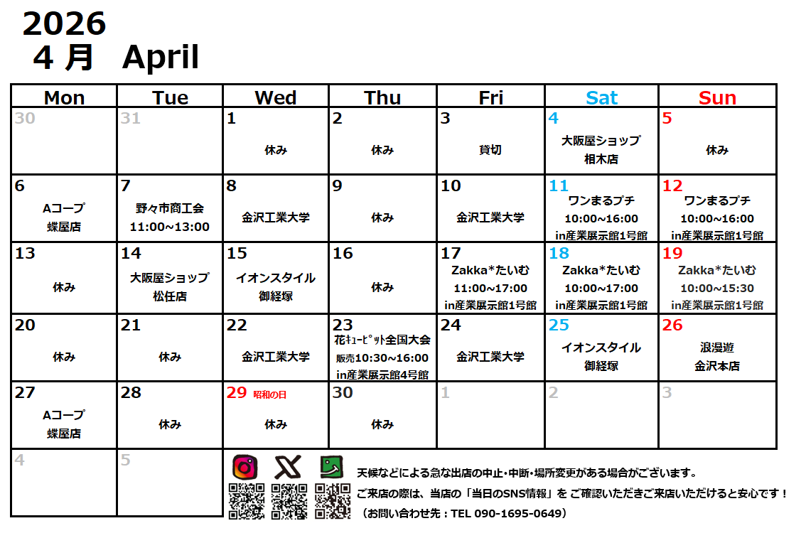 天候による急な出店の中止・中断・場所変更がある場合がございます。 ご来店の際は、当店の「当日のSNS情報」をご確認いただきご来店いただけると安心です! (お問い合わせ先:TEL 090-1695-0649)